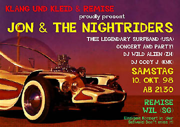 Unter anderem haben an diesem Abend auch noch Besonderes: DJ Wild Alien hatte einen Plattenaufleger dabei, welcher die Platten von DJ Wild Alien auflegte. DJ Wild Alien tanzte seinerseits die meiste Zeit herum! Sachen gibts!? :-) Souvenir: Wenn Du den Konzert- & Partyflyer vom 10.10.98 noch jemandem zukommen lassen möchtest :-) kannst Du dies per virtueller Postkarte tun! Andere aktuelle Postkarten gibts bei Klang und Kleid im Laden oder hier auf der Website. Viel Spass!